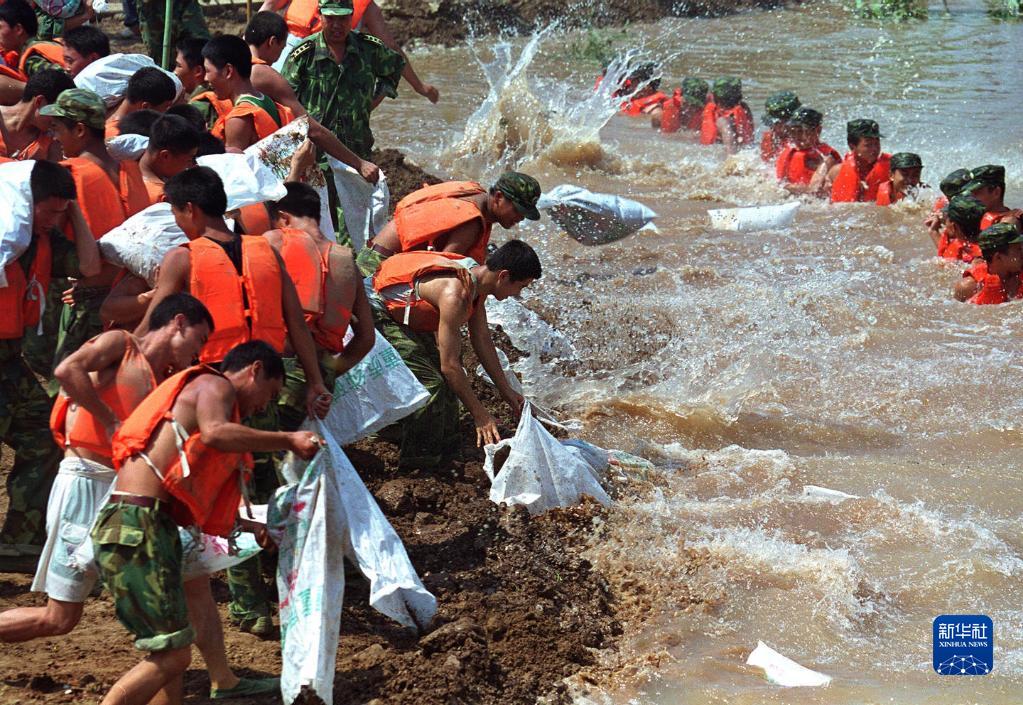 解放軍官兵在湖北石首久合垸鄉團山河支堤“管涌”險情處抗洪搶險(1998年8月11日攝)。新華社記者 李剛 攝