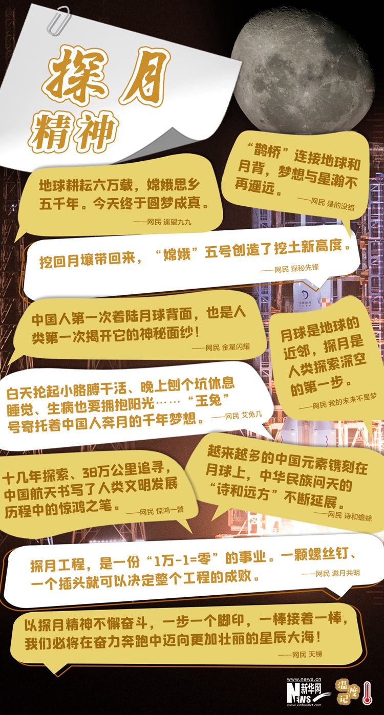 “永遠向上的精神火焰”系列網評之四十七: “我們終于擁有了自己的月壤!”2020年12月17日凌晨,嫦娥五號返回器攜帶月球樣本成功返回地球,這是21世紀人類首次月球采樣返回任務。這一刻,標志著我國探月工程“繞、落、回”三步走規劃圓滿收官,也意味著中國航天事業又向前邁出一大步。 本世紀初,我國提出探月“繞、落、回”三步走規劃。從嫦娥一號繞月探測實現中華民族千年奔月夢想,到嫦娥二號首次實現我國對小行星的飛躍探測;從嫦娥三號成功實現落月夢想,到嫦娥四號實現人類首次月球背面軟著陸……一次次與月相約的驕人成就背后,是我國無數追月逐夢的華夏兒女為探索浩瀚宇宙、發展航天事業、建設航天強國邁出的堅實步伐。 探索月球是一份“1萬-1=零”的事業,伴隨著風險、挑戰和未知,一顆螺絲釘、一個插頭甚至就可以決定整個工程的成敗。十幾年的探索,38萬公里的追尋,上百家單位、幾萬名科技工作者、解放軍指戰員用心血和智慧實現了九天攬月的一次次突破、一步步跨越,也凝結了追逐夢想、勇于探索、協同攻堅、合作共贏的探月精神。 星空浩瀚無比,探索永無止境。今天,“嫦娥”奔月、“天問”赴火……中國航天夢想的種子在星際間不斷播撒,探月精神的“詩與遠方”接續傳承?!芭c月亮相約,我們無疑是認真的!”正如探月工程總設計師、中國工程院院士吳偉仁所說,當星際空間探索的接力棒傳到新一代航天人手中,牧星耕宇勇向前,太空筑夢的腳步必將邁得更深、更遠。(文字:徐可 海報設計:王曄)