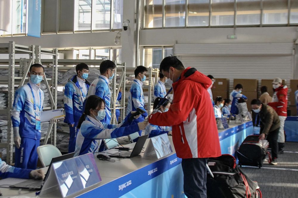 14日上午,國家雪車雪橇中心等場館運行團隊的工作人員抵達延慶制服和注冊分中心,經過測溫、掃碼、安檢、身份驗證等環節,在志愿者的引導下,有序辦理證件注冊,現場試穿并領取制服裝備。