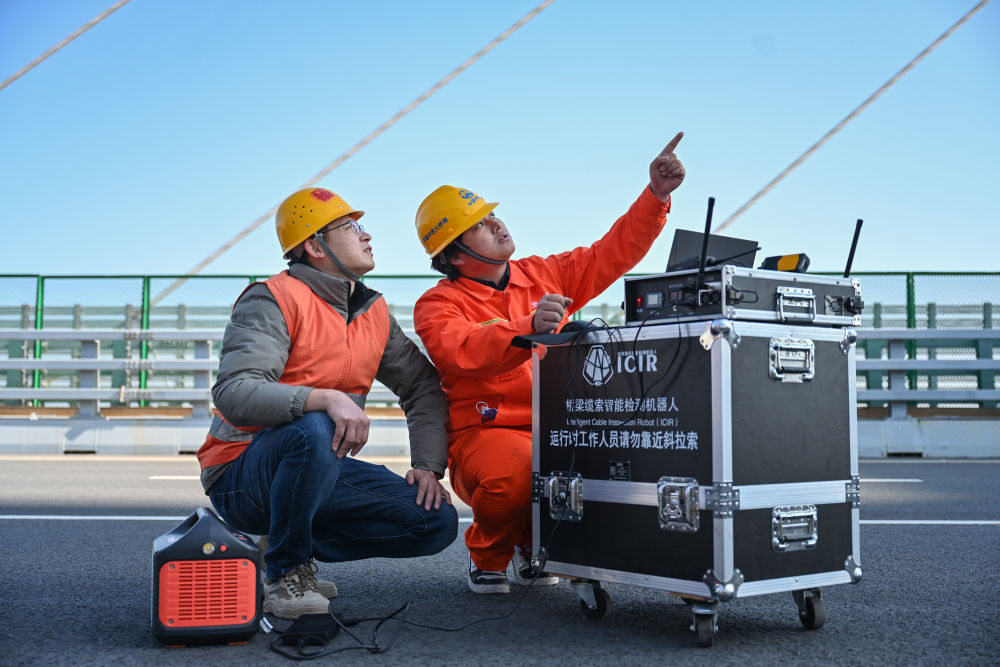 1月8日,在福建平潭公鐵兩用跨海大橋,福州工務段工作人員在調試橋梁纜索智能檢測機器人參數。