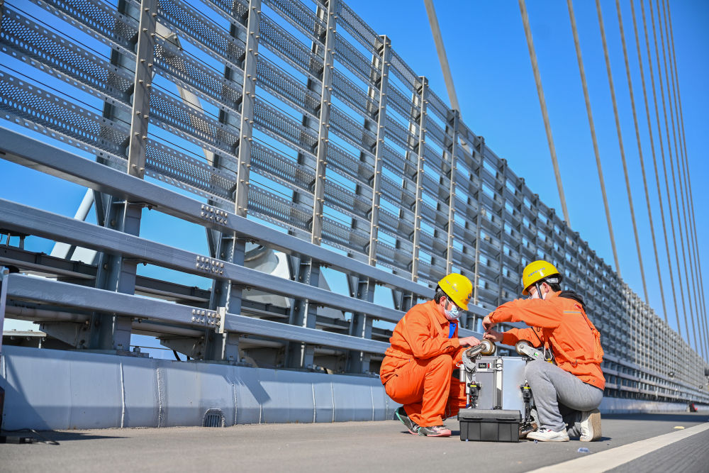 1月8日,在福建平潭公鐵兩用跨海大橋,福州工務段工作人員在檢修斜拉索錨頭封蓋。