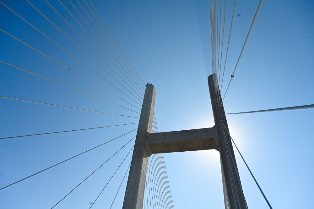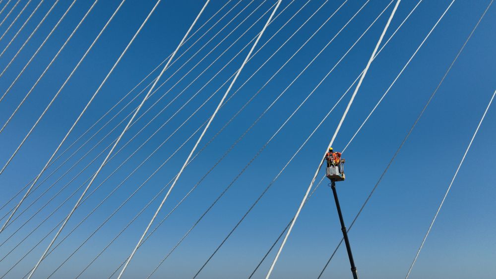 1月8日,橋梁纜索智能檢測機器人對福建平潭公鐵兩用跨海大橋的斜拉索進行檢測。
