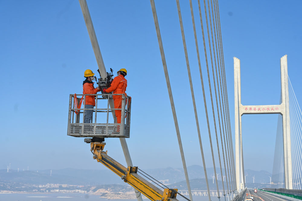 1月8日,在福建平潭公鐵兩用跨海大橋,福州工務段工作人員通過升降裝置上升到斜拉索處安裝橋梁纜索智能檢測機器人。