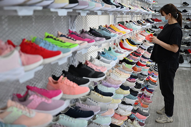 2022年5月16日,在福建省晉江國際鞋紡城,一家鞋材企業的銷售人員在整理貨架。
