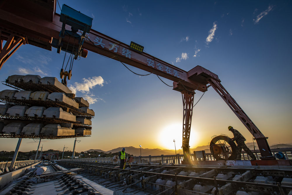 工人在新建福(州)廈(門)鐵路湄洲灣跨海大橋施工(2022年4月8日攝)。(新華社記者周義攝)