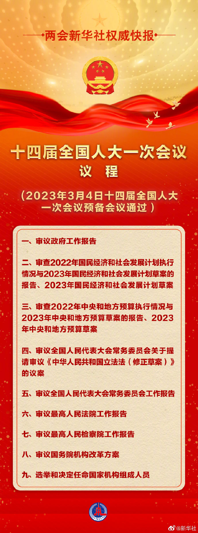 【權威快報丨全國人大會議議程來了】十四屆全國人大一次會議4日上午舉行預備會議,通過了大會議程。