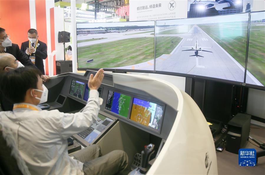 2022年11月5日,在第五屆進博會技術裝備展區霍尼韋爾展臺,參觀者在工作人員指導下體驗模擬飛行。新華社記者 張可任 攝