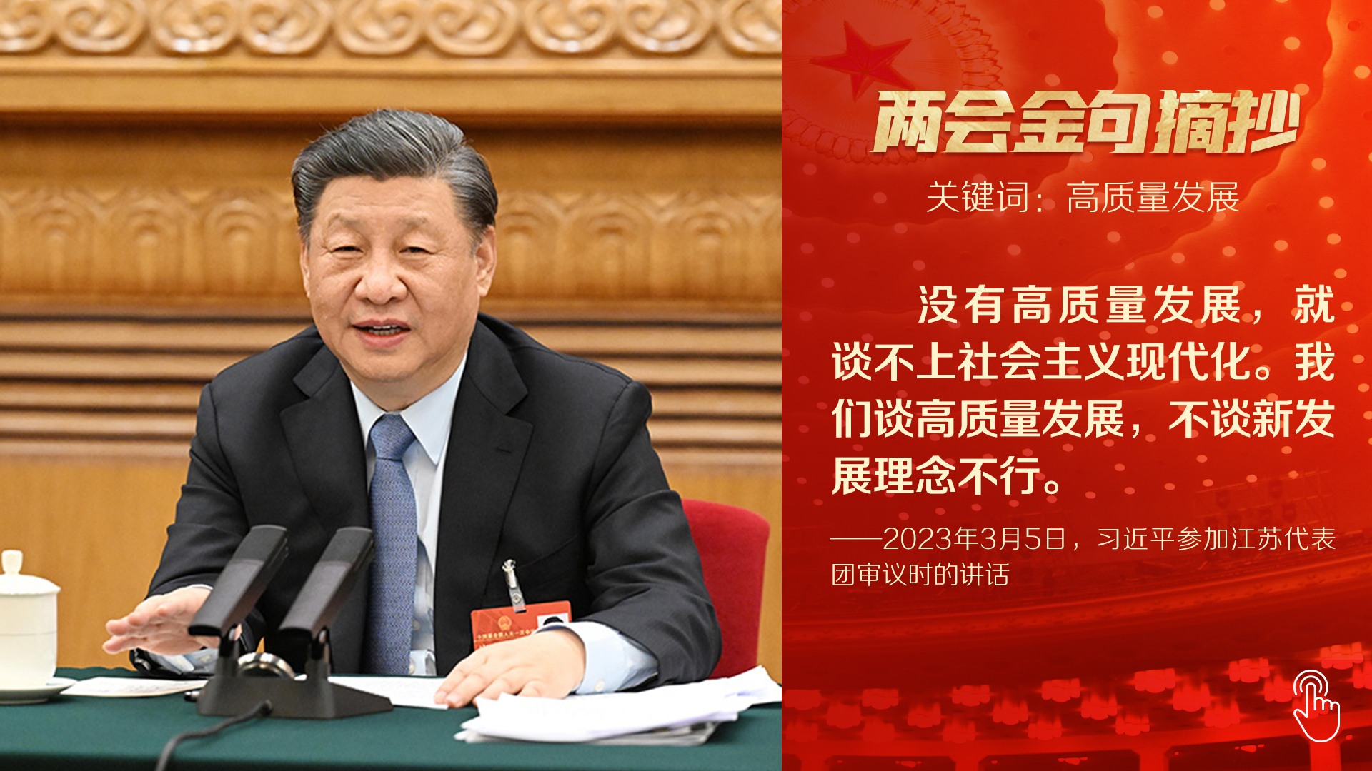 “高質量發展是全面建設社會主義現代化國家的首要任務?!苯衲陜蓵状蔚綀F組,總書記以高質量發展為題,詳細闡述中國未來施政發力點。第二天參加民建、工商聯界委員聯組會,他又就正確引導民營經濟健康發展、高質量發展作出重要論述,一句“要堅守主業、做強實業,自覺走高質量發展路子”為全國4700多萬家民營企業指明方向。十四屆全國人大一次會議閉幕會上,總書記再次向世界宣示:在強國建設、民族復興的新征程,我們要堅定不移推動高質量發展。