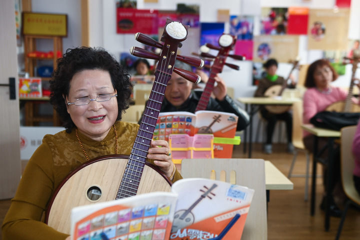 在浙江省嘉興市南湖區桂苑社區的老年大學活動室內,老人們在老師的指導下學琴(2023年3月7日攝)。新華社記者 徐昱 攝