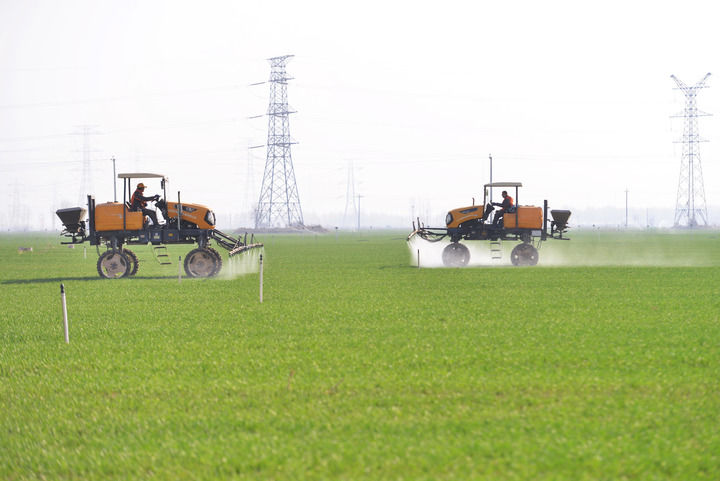 河北省晉州市槐樹鎮北白水村一家農業合作社的社員操作農業機械給冬小麥噴灑農藥(2023年3月14日攝)。