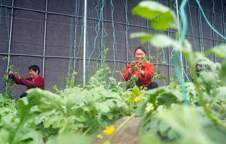 農戶在河北滄州渤海新區黃驊市一處農業科技示范園為西瓜秧整枝(2023年2月11日攝)。新華社記者 駱學峰 攝