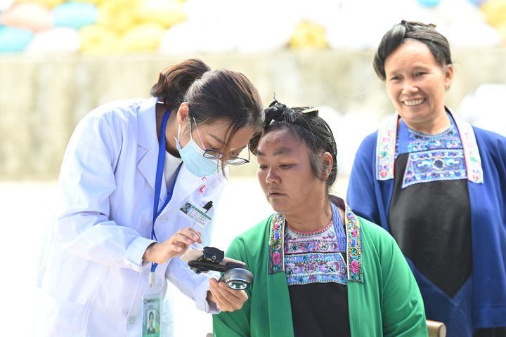 在廣西融水苗族自治縣白云鄉幫陽村,來自廣東醫科大學附屬醫院的李芳谷博士(左)在“送醫進苗寨”活動上給村民提供醫療服務(2022年10月26日攝)。