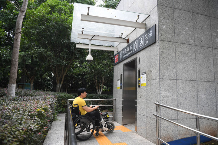 伍樹林在湖南省長沙市桂花坪地鐵站外等候無障礙電梯進站(2021年8月25日攝)。新華社記者 薛宇舸 攝