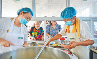 8月6日,河北省獻縣段村鎮段村中學安置點,群眾在排隊取餐。 本報記者 陳 斌攝