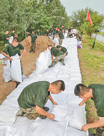 日前,天津市靜海區臺頭鎮大清河南岸,武警天津總隊官兵在加固堤壩。 武警天津總隊供圖