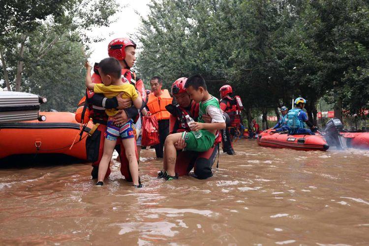 △8月3日,河北涿州北二環附近,山東消防救援人員抱著孩子通過積水路段。