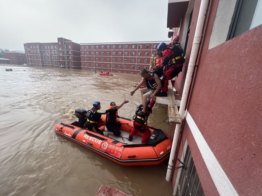 “對黨忠誠、紀律嚴明、赴湯蹈火、竭誠為民”,訓詞錚錚,其心拳拳。 今年入汛以來,作為應急救援的主力軍和國家隊,國家綜合性消防救援隊伍堅決貫徹落實習近平總書記重要指示精神和黨中央、國務院決策部署,聞警即動、沖鋒在前。一個個橙色身影迎風而立、迎水而擊,以實際行動踐行訓詞精神,在災區筑起一道道堅不可摧的橙色“大壩”。 雨聲就是哨聲,汛情就是號令。 洪水侵襲河北涿州,8月2日晚,靖雅學校內1400余名村民被困。圍墻開始倒塌,大水灌進教室,朝著二樓漫去。警情驟增,河北、山東消防救援隊伍接令緊急馳援。 洪水湍急,救援艇無法靠近樓體?!叭嗣P天!黨員跟我一起先跳!”唐山市消防救援支隊消防員周恒和隊員們相繼跳入激流,涉水泅渡,奮力將導向繩系在樓體上,開辟出一條條救援通道。 教學樓窗臺和救援艇有一米多的高度差,濟南市消防救援支隊消防員曹博源上前半蹲馬步、雙手緊緊抓住窗臺,以肩為梯、以背為橋,用身體架起一座堅實的“人梯”,讓被困群眾踩著他的肩背登上舟艇。