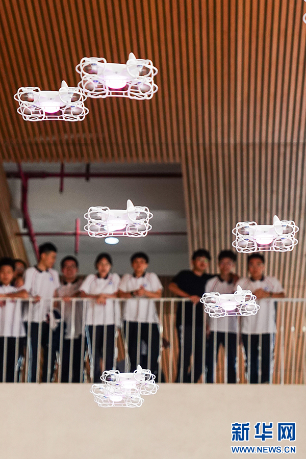 9月12日,福州第三中學,師生操作無人機進行編隊飛行表演。新華網 肖和勇 攝