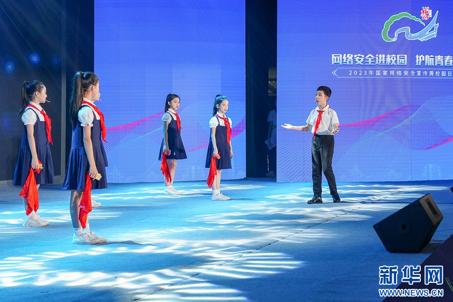 9月12日,校園日活動啟動儀式上,學生表演“文明凈網”主題音樂快板節目。新華網 肖和勇 攝