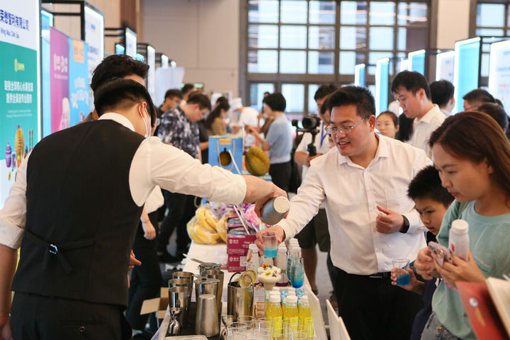在深圳舉行的進博會展前供需對接活動上,波蘭投資貿易局的工作人員(左前)向采購商展示風味啤酒(2023年8月29日攝)。新華社記者 毛思倩 攝