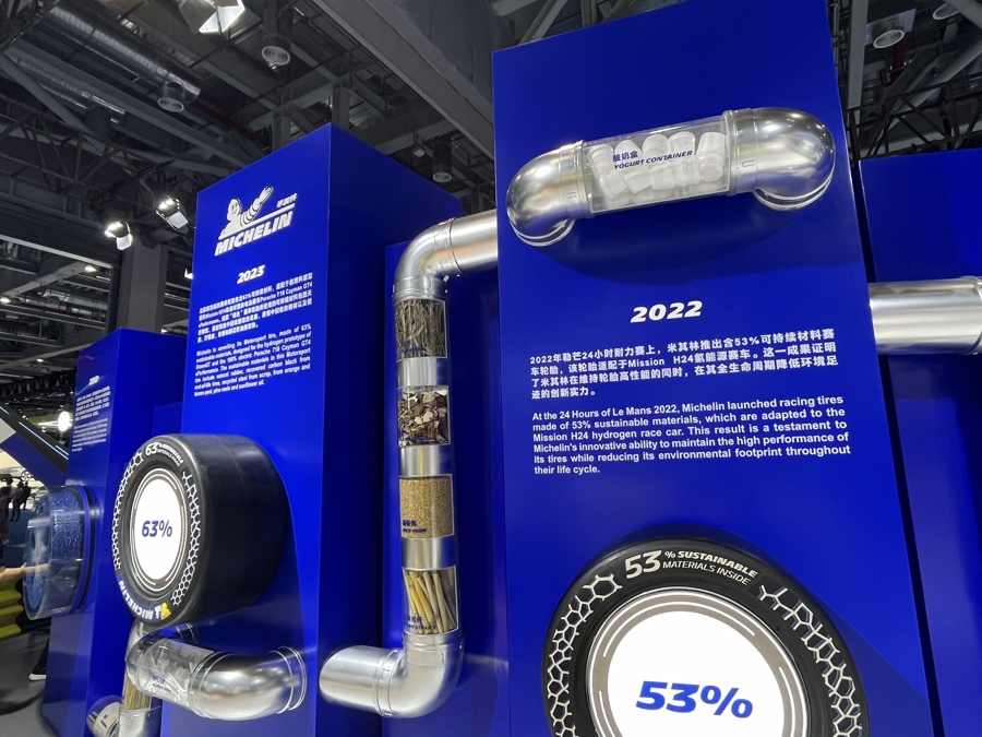 選手和“教練”能夠實現流暢對話,實際上就是依靠今年爆火的自然語言處理技術。隨著人工智能學科的不斷進步,十年間歐姆龍乒乓球教練機器人變得越來越智能,越來越“懂你”。 “第一代乒乓球機器人連回球都是一個很吃力的事情,而且經常會出故障,那個時候真的有點‘傻’?!眲钥』貞?,機器人升級到第二代、第三代,可以順暢地接球,但仍然是一個“業余選手”。 隨著自動化技術的不斷進步,機器學習的不斷深入,今天,第八代乒乓球機器人已經可以和奧運冠軍進行切磋。奧運冠軍陳玘在現場體驗后表示,這臺乒乓球教練機器人已經可以達到青少年冠軍的相同水平。 零部件越來越“綠色” 如果說技術裝備館致力于實現“人機融合”,那么在更多進博的場館中,人與自然的融合則蔚然成風。從細微做起,許多進博會的展品正在變得越來越“綠色”:消費展區,洗發水的包裝悄悄變成了可回收環保材質;醫療器械展區,生物醫藥企業搬出了使用綠電的“碳中和”工廠;食品展區,水果商拿出了瑕疵水果制作的生物皮革…… 本屆進博會,米其林帶著其最新一代可持續材料輪胎亮相展臺,這款輪胎也是進博會的明星展品之一。今年9月底,米其林的“綠色輪胎”從盧森堡運抵上海浦東國際機場,經上海海關快速審核后“秒放”通關,順利入境,成為本屆進博會首票入境的展品。 自2021年起,這款“綠色輪胎”就開始在進博會持續亮相。當年,這款輪胎的可持續材料含量為46%。到了2022年,含量升到了53%。今年,這款輪胎的可持續材料含量提高至63%。米其林中國研發中心總經理高德華介紹,這款明星輪胎所使用的可持續材料包括天然橡膠、廢舊輪胎中回收提取的炭黑、廢鋼中回收的鋼材、以及橙皮、檸檬皮、松香和葵花籽油提取物,專門適配于氫燃料原型賽車Mission H24和保時捷的電動賽車Porsche 718 Cayman GT4 ePerformance。