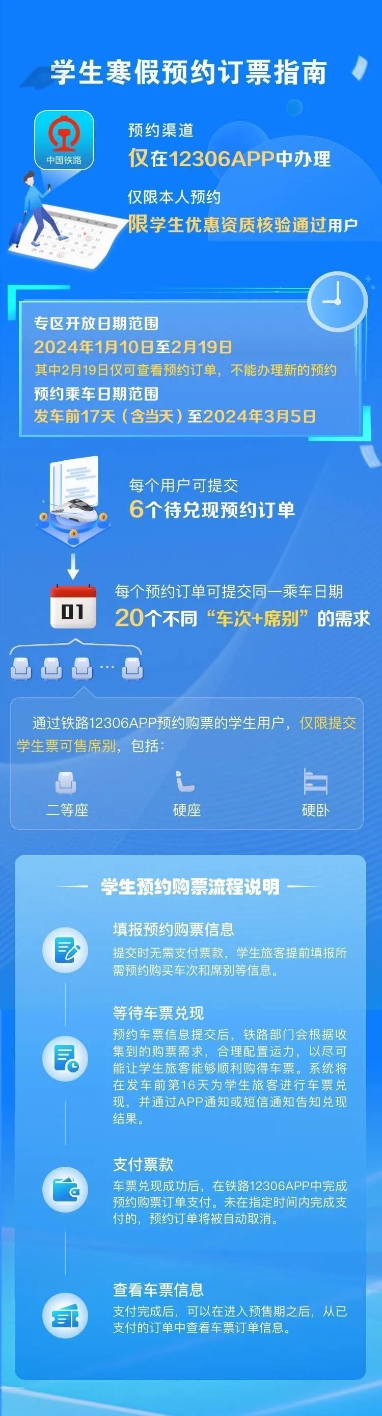 鐵路12306科創中心相關負責人介紹,為認真貫徹落實黨中央國務院關于做好2024年元旦春節期間有關工作的要求,保障學生、務工人員等重點群體春運出行,鐵路12306創新服務舉措,為學生、務工人員推出了售票服務專區。自1月10日起,符合條件的學生旅客(已通過學生優惠資質核驗且有剩余優惠乘車次數)可通過“學生寒假訂票專項服務”專區預約購買春運期間(1月26日至3月5日)火車票,每名旅客最多可同時提交6個預約訂單,每個訂單可添加1個乘車日期的20個“車次+席別”的組合,可選席別為學生優惠票適用的硬座、硬臥、二等座。已通過實名制核驗的務工人員可通過“務工人員春運預約訂票服務”專區預約購買春運期間火車票,每名旅客可同時提交6個預約訂單,每個訂單可選擇“時間+車次+席別”的1個組合。