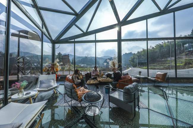 在獵神村礦咖民宿全景玻璃陽光室,山中風景一覽無余。熊偉攝