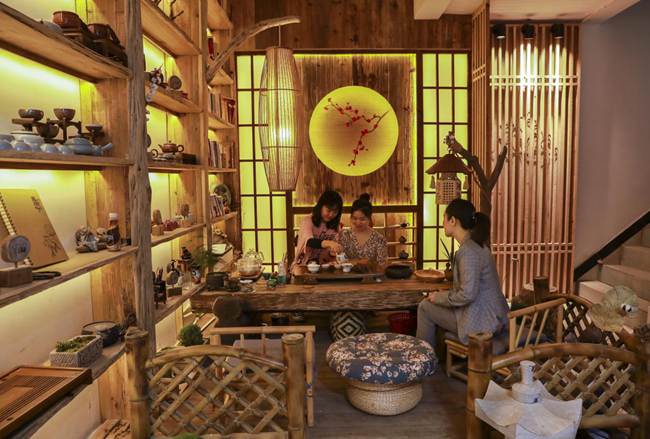 游客在獵神村商業街內茶室品茶。熊偉攝