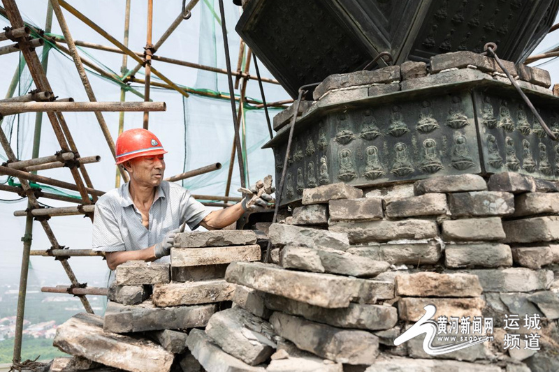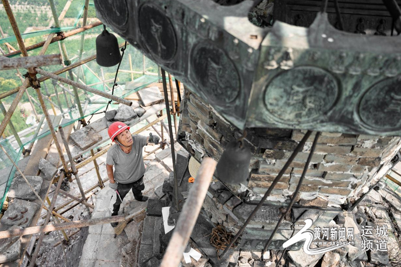 修繕中的多寶塔。蘭立強 攝 塔頂的微風輕輕拂過,工匠們的衣角隨風飄動。他們的臉上雖淌滿汗水、寫滿疲憊,但眼神中卻透露出執著。在他們身后,是遼闊無垠的天空和連綿起伏的中條山脈,仿佛在默默見證著這場與時間賽跑的修繕之旅。