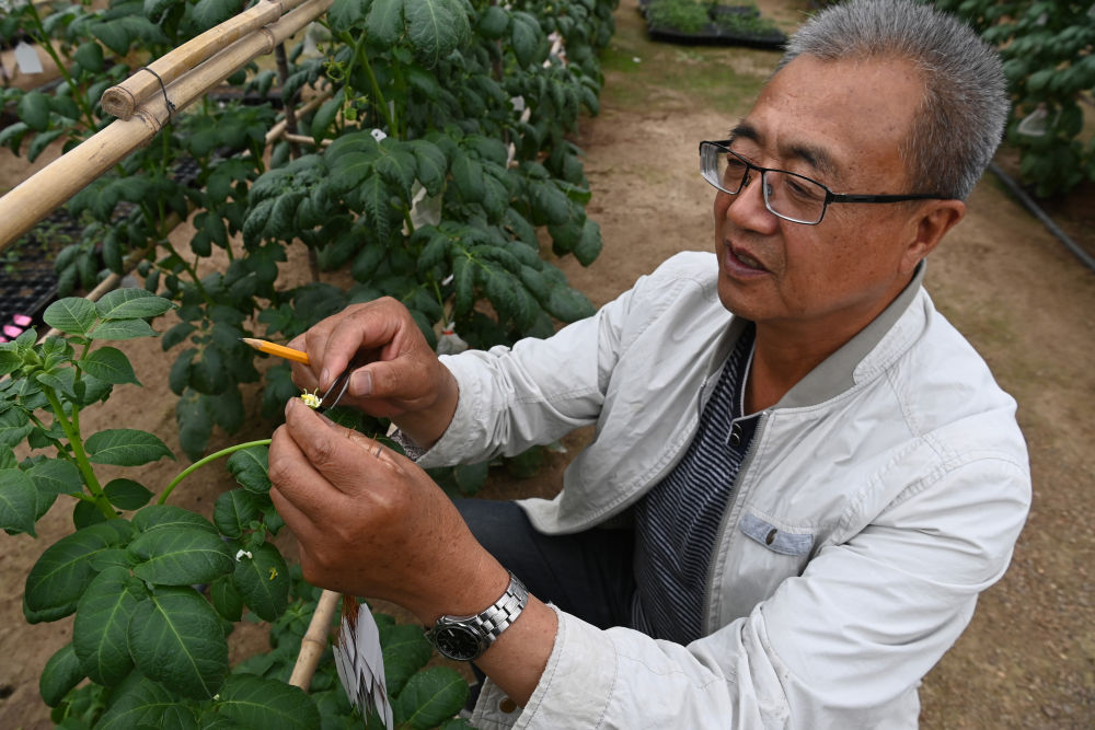 7月24日,在定西馬鈴薯研究所,研究人員給馬鈴薯植株授粉。新華社記者 范培珅 攝