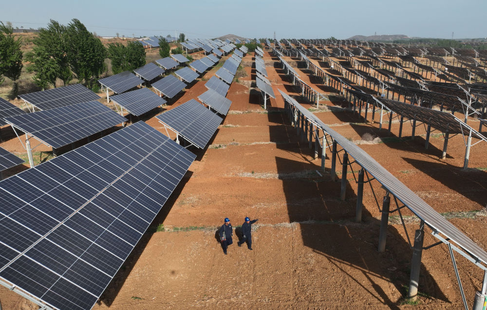 2024年4月16日,工人在河北省石家莊市靈壽縣譚莊鄉程家莊村的“農光互補”光伏發電場巡查(無人機照片)。新華社記者 楊世堯 攝