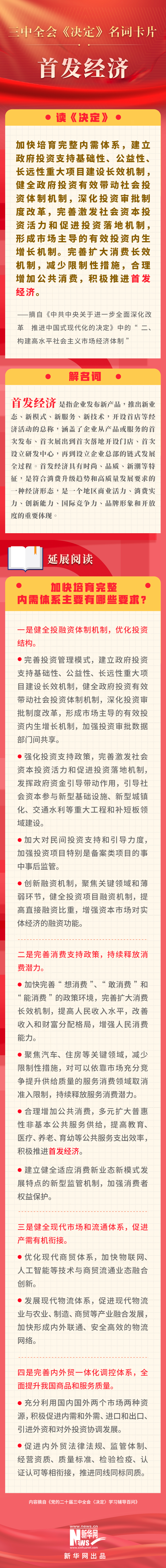 黨的二十屆三中全會審議通過了《中共中央關于進一步全面深化改革、推進中國式現代化的決定》。新華網依據《黨的二十屆三中全會〈決定〉學習輔導百問》,制作三中全會《決定》系列名詞卡片,和大家一起來深入學習領會二十屆三中全會精神。本期名詞是“首發經濟”。