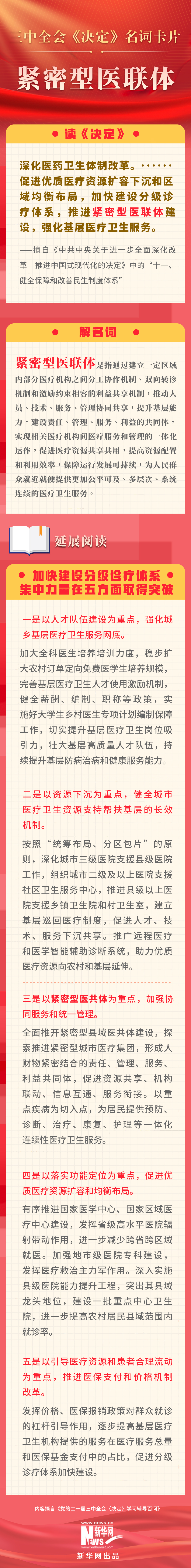 黨的二十屆三中全會審議通過了《中共中央關于進一步全面深化改革、推進中國式現代化的決定》。新華網依據《黨的二十屆三中全會〈決定〉學習輔導百問》,制作三中全會《決定》系列名詞卡片,和大家一起來深入學習領會二十屆三中全會精神。本期名詞是“緊密型醫聯體”。