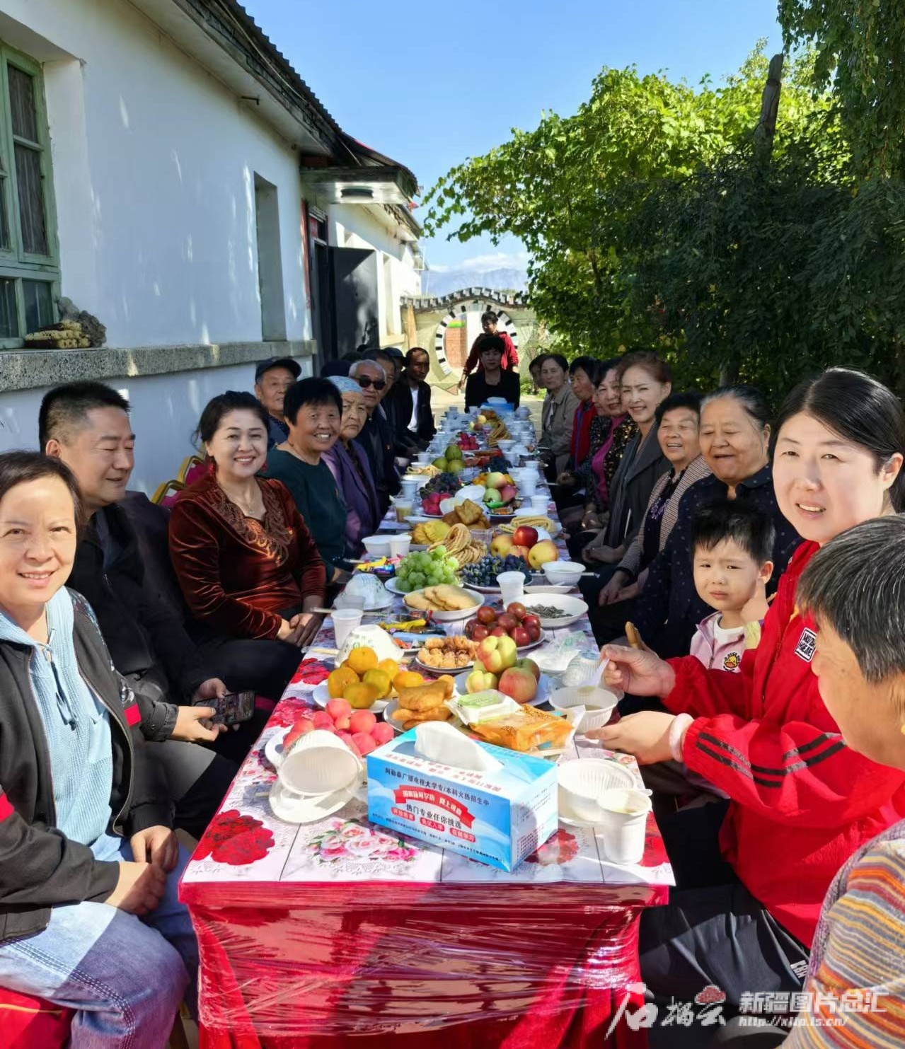 葡萄架旁,白樺樹下,長條桌上月餅、馓子、奶疙瘩、果醬、葡萄、蘋果擺得滿滿當當,奶茶的醇香撲鼻而來。紅墩鎮30多位居民坐在桌前,談笑風生。大院女主人李紅秀跑前跑后忙個不停。