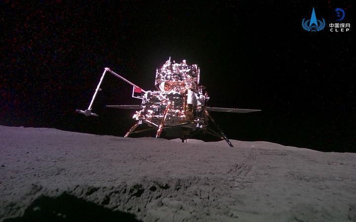 △2024年6月3日,嫦娥六號攜帶的“移動相機”自主移動后拍攝并回傳的著陸器和上升器合影。