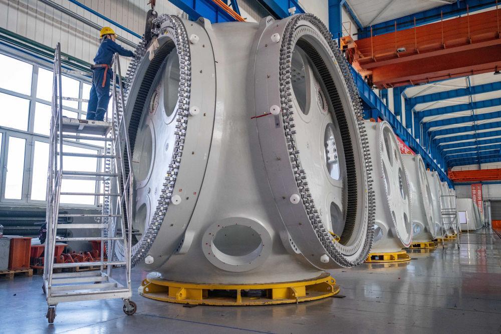 △2024年4月28日,工作人員在中國一重集團有限公司的風電設備裝配車間內加工風電輪轂。