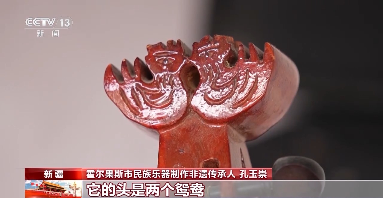 霍爾果斯市民族樂器制作非遺傳承人 孔玉崇:鴛鴦是很美好的,它有兩個腹板,也可以互為背板。它的頭是兩個鴛鴦,在一個腿上可以彈,坐著也可以拉,很方便。你帶著這么一把琴就等于帶了兩把琴,因為它拉的也有,彈的也有。 今年83歲的孔玉崇,退休前是霍爾果斯伊車嘎善鄉小學的一名教師,從小就癡迷于各種樂器的演奏和制作。老人說,在他懵懂的少年時代,就一直聽到當地有一個關于鴛鴦琴的傳說。