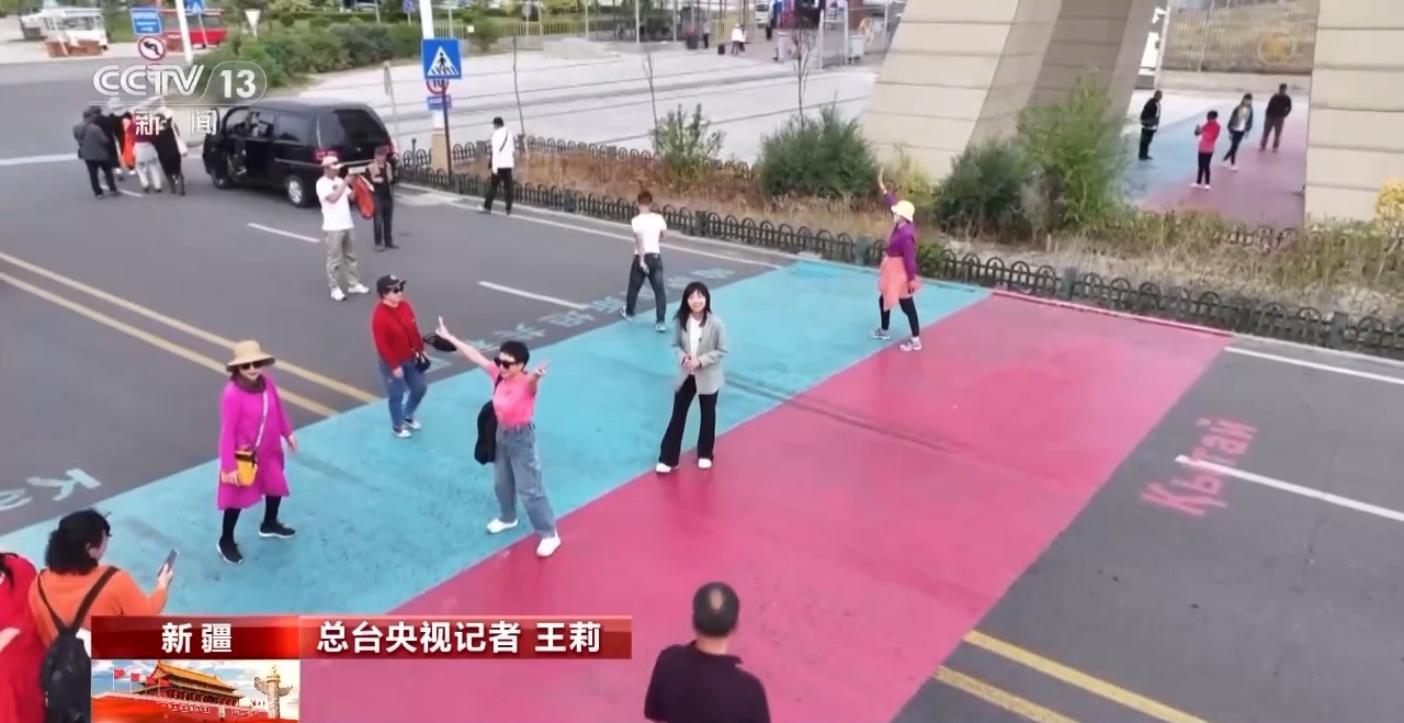 總臺央視記者 王莉:進入合作中心,中哈連接通道處的“一步跨兩國”,絕對是游客的打卡首選地。紅色和藍色交界的地方,就是國界線了,線的一側紅色區域代表中國,藍色區域代表哈薩克斯坦。前一秒還在中國,只要一腳邁過分界線,就能一秒“出國”,來到哈薩克斯坦。