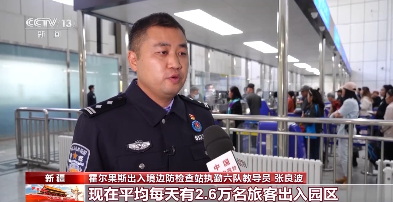 霍爾果斯出入境邊防檢查站執勤六隊教導員 張良波:現在平均每天有2.6萬名旅客出入園區,為最大限度保障旅客高效快速通關,我們采取錯時通關模式。我們也會根據旅客的流量情況,動態調整我們的人工查驗通道,最高可以加開到12條。 中哈霍爾果斯國際邊境合作中心是全球唯一一個跨越國界、由兩個國家的國土構成的跨境經濟貿易區。