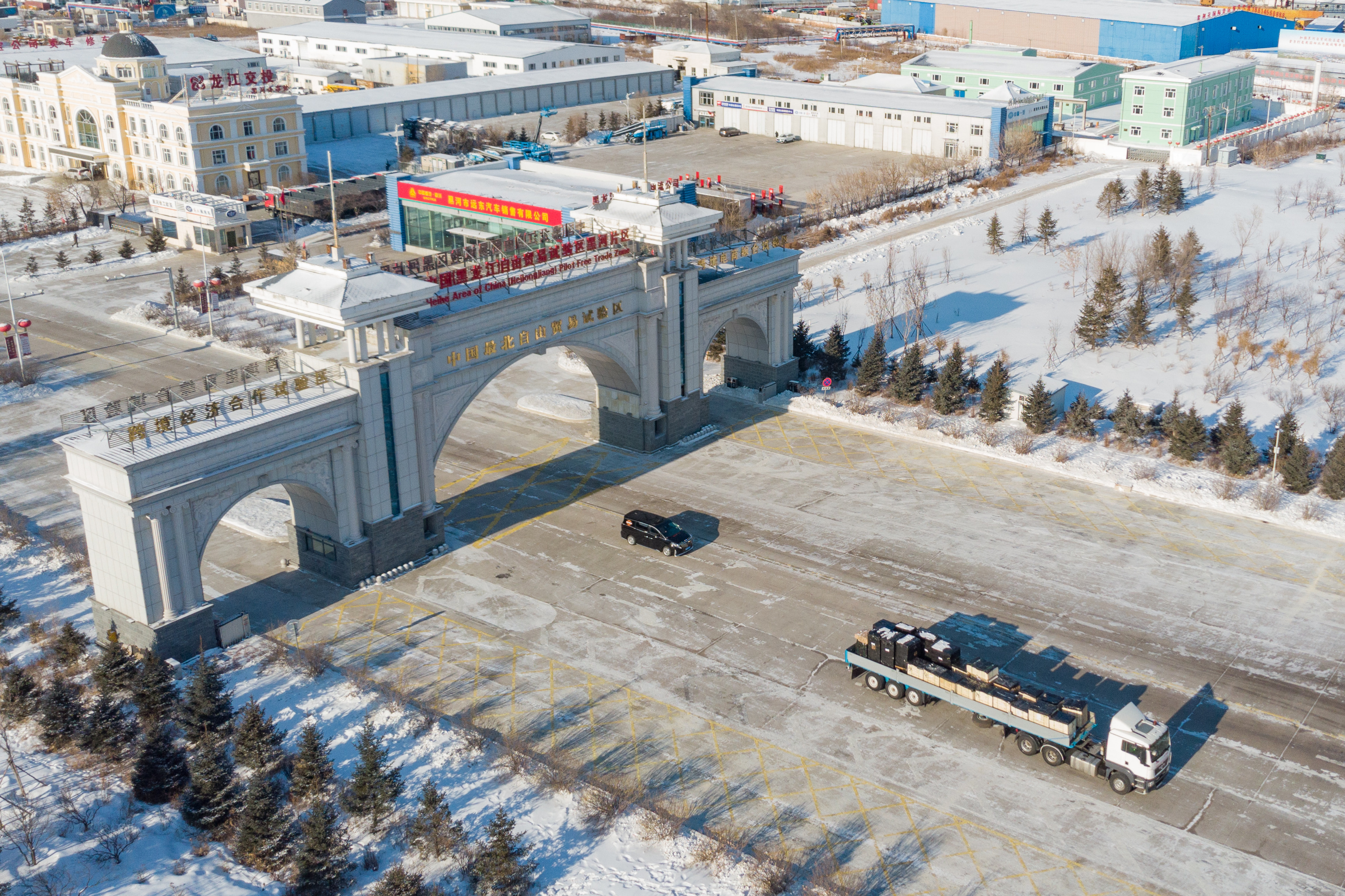 這是中國(黑龍江)自由貿易試驗區黑河片區(2024年1月31日攝,無人機照片)。2023年,該自貿片區外貿進出口總值達244.82億元,實現增幅56.9%,引進外資企業16家,直接利用外資127.3萬美元,同比增長27.3%。