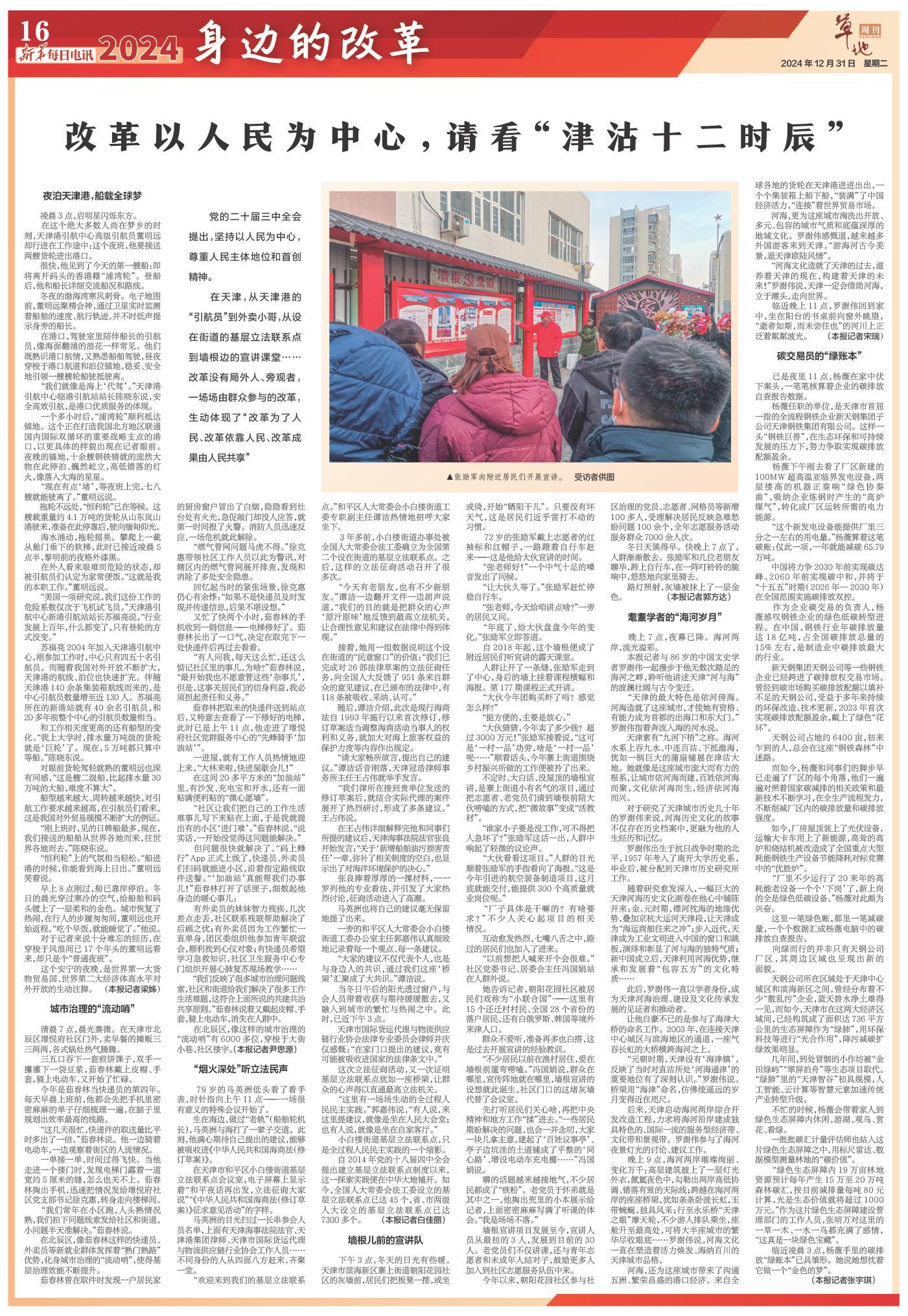 在天津,從天津港的“引航員”到外賣小哥,從設在街道的基層立法聯系點到墻根邊的宣講課堂……改革沒有局外人、旁觀者,一場場由群眾參與的改革,生動體現了“改革為了人民、改革依靠人民、改革成果由人民共享”