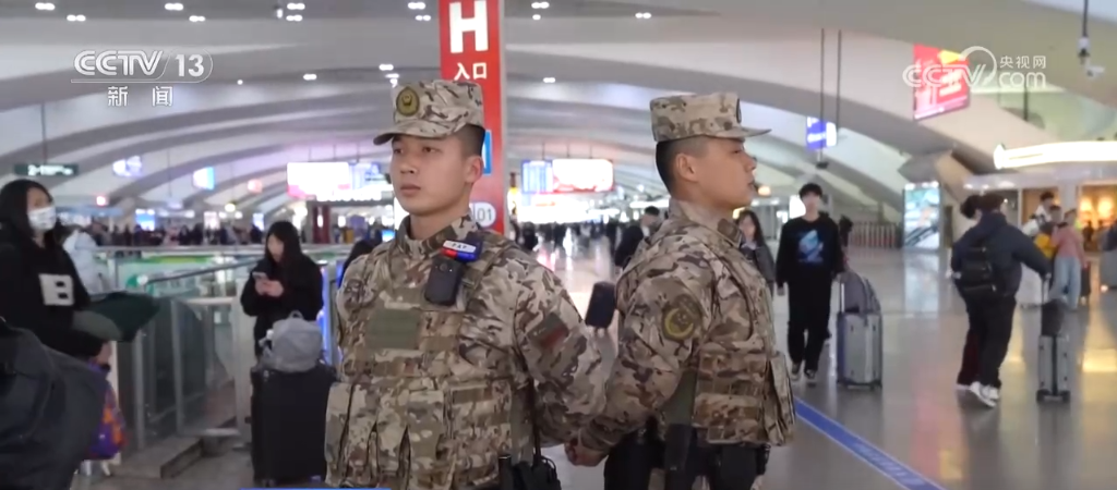 央視網消息:春運期間,全國各地旅客出行顯著增加,擔負執勤任務的武警部隊官兵堅守執勤一線,科學進行人員編組,在機場、高鐵等人流聚集處加強警戒、疏導巡邏,為旅客安全出行保駕護航。
