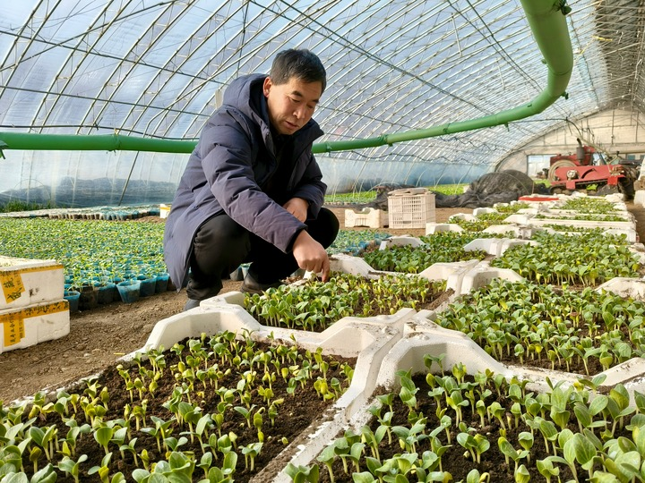 臨江市大栗子街道望江村一名村干部查看蔬菜苗長勢。新華社記者 宗巍 攝