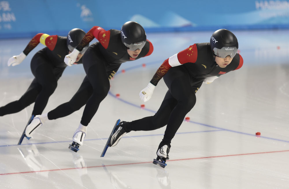 2月10日,中國隊選手高亭宇(右)、寧忠巖、廉子文(中)在比賽中。當日,第九屆亞冬會速度滑冰男子短距離團體追逐賽在哈爾濱舉行。中國隊獲得冠軍。新華社記者 呂帥 攝