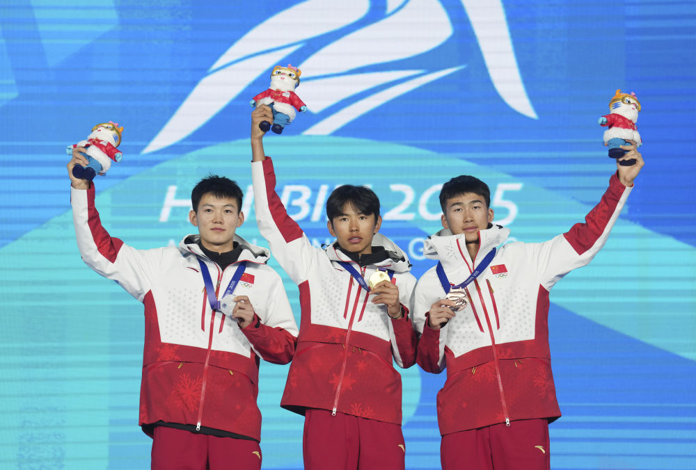 2月9日,布魯爾(中)、張成浩(左)和畢禹新在頒獎儀式上。當日,在第九屆亞冬會滑雪登山男子短距離決賽中,中國選手布魯爾、張成浩和畢禹新包攬前三名。新華社記者 王松 攝