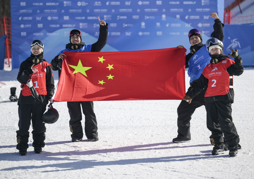 2月10日,中國選手張小楠、楊文龍、姜鑫杰與熊詩芮(從左至右)在比賽后慶祝。當日,在亞布力舉行的第九屆亞冬會單板滑雪女子大跳臺決賽中,中國選手熊詩芮奪冠,張小楠獲得亞軍;在男子大跳臺決賽中,中國選手楊文龍奪冠,姜鑫杰獲得亞軍。新華社記者 牟宇 攝