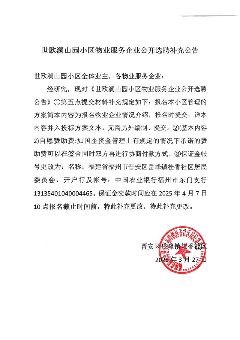 世歐瀾山園小區物業服務企業公開選聘補充公告