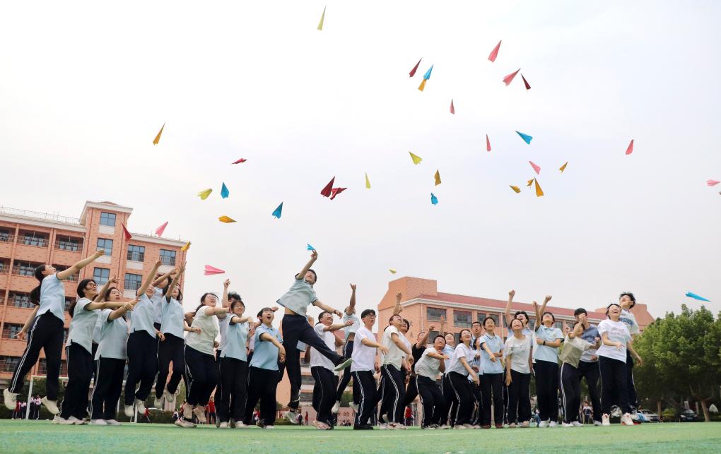 5月22日,在山東省高密市第五中學,高三學生將寫有夢想的紙飛機拋向空中。高考臨近,各地學校組織高三學生開展不同形式的減壓活動,幫助學生放松心情,迎接高考。 新華社發(李海濤攝)