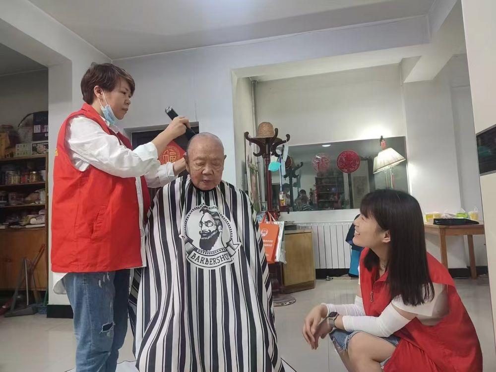 △陜西西安碑林區黃雁社區的工作人員和志愿者上門為留守老人提供剪發服務。