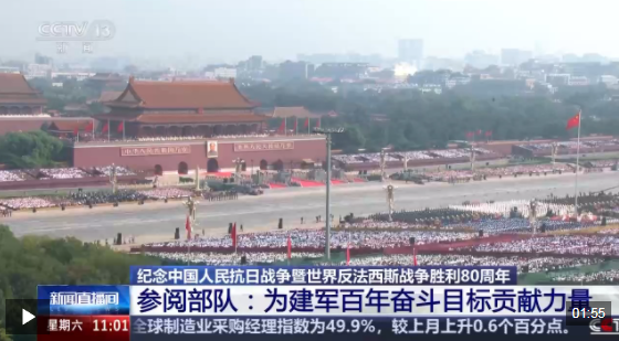 紀念中國人民抗日戰爭暨世界反法西斯戰爭勝利80周年大會9月3日隆重舉行。受閱部隊作為共和國武裝力量的代表,光榮接受了黨和人民的檢閱。中央軍委主席習近平簽署通令,嘉獎參閱全體人員。廣大參閱官兵備受鼓舞,一致表示,一定不負習主席重托,為如期實現建軍一百年奮斗目標、加快把人民軍隊建成世界一流軍隊不懈奮斗。